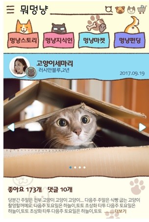반려동물에 대한 궁금증을 물어볼 수 있는 '멍냥지식인' 코너에서는 나와 비슷한 종류의 반려동물 육아경험이 있는 선배에게 정보를 공유 받을 수 있도록 구성했다. 아울러 반려동물 잇템을 만나볼 수 있는 '멍냥마켓'도 선보인다.