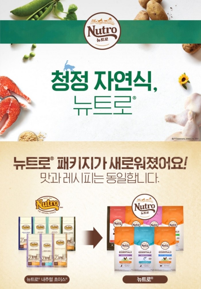 내추럴사료 브랜드 뉴트로(Nutro)의 반려묘용 건사료가 '청정 자연식' 철학을 담아 새롭게 태어났다. 뉴트로는 자연 그대로의 믿을 수 있는 원료로 만들어진 사료라는 의미인 '청정 자연식' 컨셉으로 브랜드를 리뉴얼하고 기존 반려묘용 건사료인 '뉴트로 내추럴 초이스'의 맛과 레시피는 그대로 브랜드명과 패키지 디자인을 변경했다.