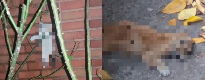 현장에서는 나무 줄기에 목이 감겨 죽은 새끼 고양이와 꼬리가 훼손된 채 죽은 새끼고양이의 사체가 발견됐다.