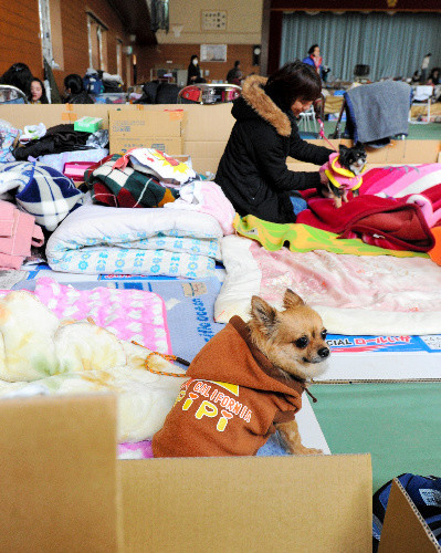 일본 아사히 신문 보도에 따르면 이와테현 오후나토시의 오후나토 중학교 체육관 구석에는 파이프 의자와 골판지 상자로 나눠진 곳이 있다. 반려견과 함께하는 재해민을 위한 공간이다. 이는 반려동물에 대한 민원이 눈에 띄게 많아졌기 때문이라는 것이 대피소 자치 조직의 설명이다.