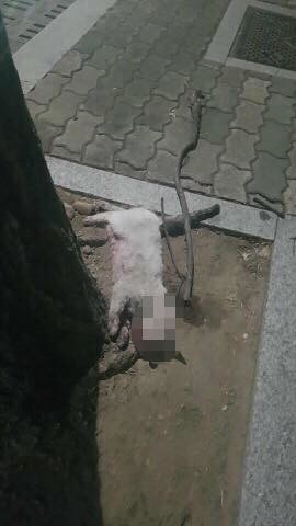 공개된 사진에는 눈이 나뭇가지에 찔린 흰 고양이의 사체가 길바닥에 누워있는 모습이 담겼다. 모자이크 처리가 됐지만 고양이가 끔찍한 폭행으로 고통받았음을 짐작할 수 있다.