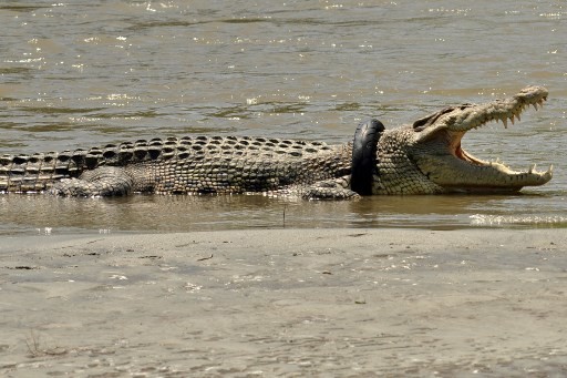 인도네시아의 한 바다악어가 목에 타이어가 끼어 고통받고 있다.[사진=Coconuts] |