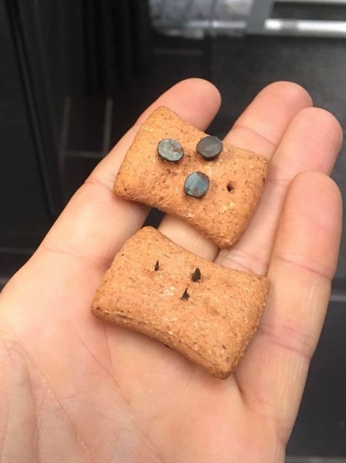 반려견들이 먹으려고 했던 것은 다름 아닌 못 박힌 비스켓이었던 것이다. 누군가 고의로 못을 꽃아놓은 듯이 날카로운 못이 촘촘히 박혀 있었다.