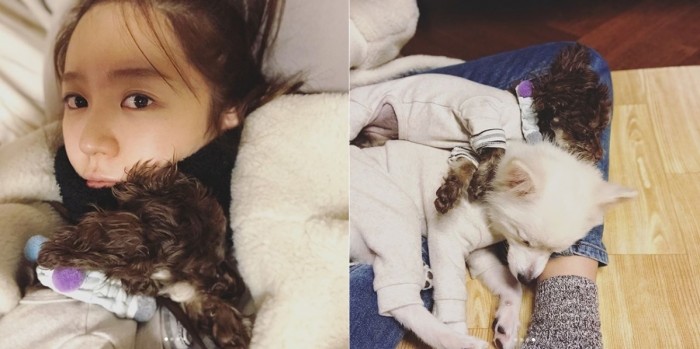 아울러 공개한 사진에는 흰색 털을 가진 온유와 곱슬거리는 갈색 털을 가진 기쁨이가 무릎에서 잠든 모습이 담겨있다.