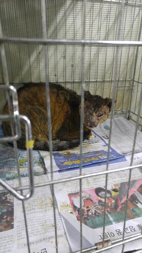 지난 3일 대구유기동물보호소에 입소한 길고양이는 얼굴 피부가 녹아내린 채로 대구시 검단공단 인튼 공터에서 움츠린 채 발견됐다.
