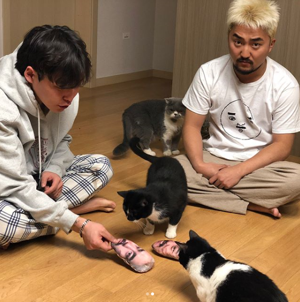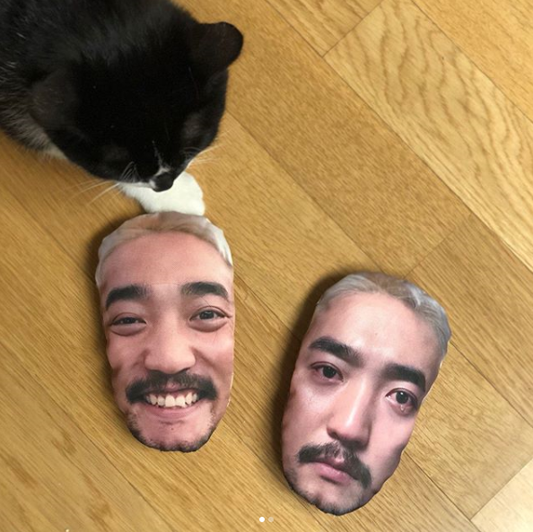 사진 속에는 유병재 얼굴로 만들어진 쿠션과 흥미를 보이는 고양이의 모습이 담겼다.