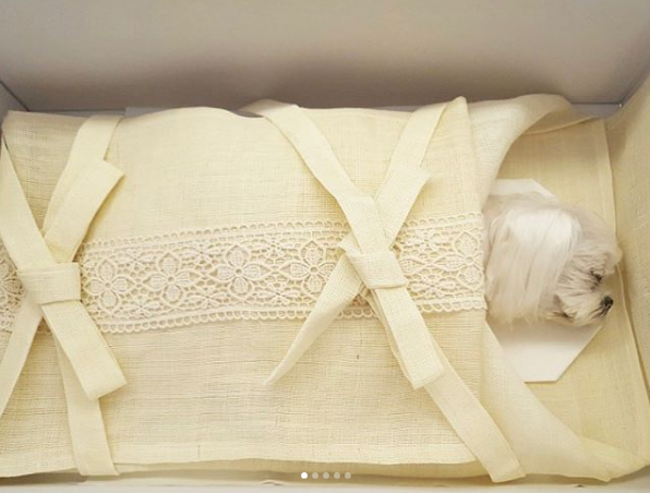 사진 속에는 흰색 강아지가 수의를 입고 평안히 눈을 감고 있다.