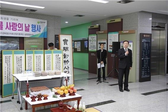대구경북첨단의료산업진흥재단(이하 첨복재단) 실험동물센터는 24일 실험동물센터 2층 로비에서 '실험동물 사랑의 날' 행사를 열고 신약과 의료기기 개발을 위해 희생된 동물들을 애도 했다.