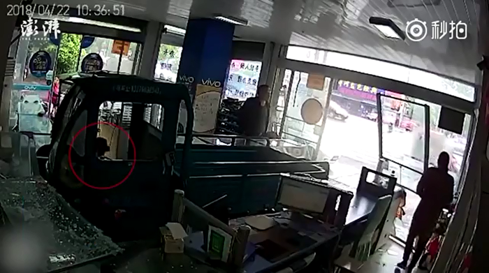 지난 22일 오전 펑파이 신문은 중국 장쑤성 타이싱의 한 휴대폰 매장에 삼륜차 한 대가 돌진했다.