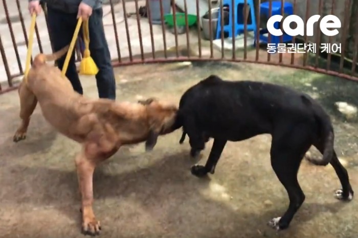 급습한 투견장에서 누렁이와 검은 개가 발견됐다. 케어 활동가들과 경찰을 보자마자 10명 남짓한 사람들이 황급히 밭으로 한달음에 도망갔다. 투견장 안에서는 막 싸움이 시작되어 개들이 뒤엉켜있었다.