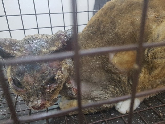 경기도 김포시에서 사람의 학대로 인해 얼굴과 목 주변에 심한 화상을 입은 고양이가 발견됐다.