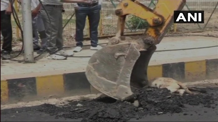 14일(현지 시각) 인도 북부 아그라에서 도로포장 공사를 하던 인부들이 도로에서 자고 있던 강아지 위에 아스팔트를 부었다.