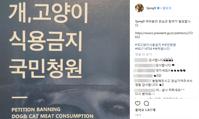 오종혁이 자신의 인스타그램에 개, 고양이 식용금지 국민청원 링크를 공유했다.[사진=오종혁 SNS 캡처] |