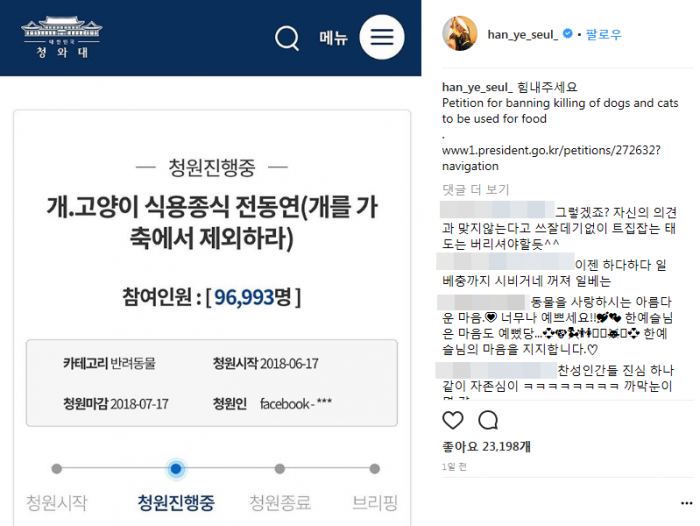 개, 고양이 식용금지 국민청원은 한예슬뿐만 아니라 배우 김효진, 가수 조권, 오종혁 역시 참여를 독려한 바 있다.