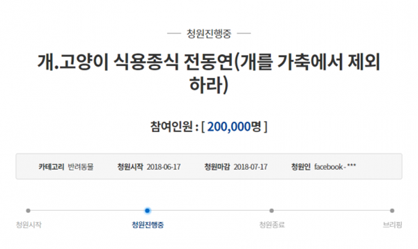 청와대 홈페이지에 올라온 '개·고양이 식용종식 전국동물활동가연대(개를 가축에서 제외하라)'이라는 제목의 국민청원은 청원 종료 6일을 남긴 11일 오전 10시 18분 20만명의 동의를 얻었다.
