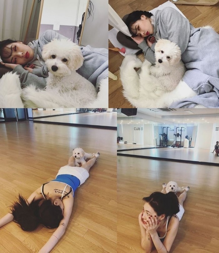 또 연습을 하다가 지친 현아가 반려견 소금이와 함께 누워있는 모습이나 현아 곁에서 잠이든 소금이의 모습도 공개해 눈길을 끌었다.