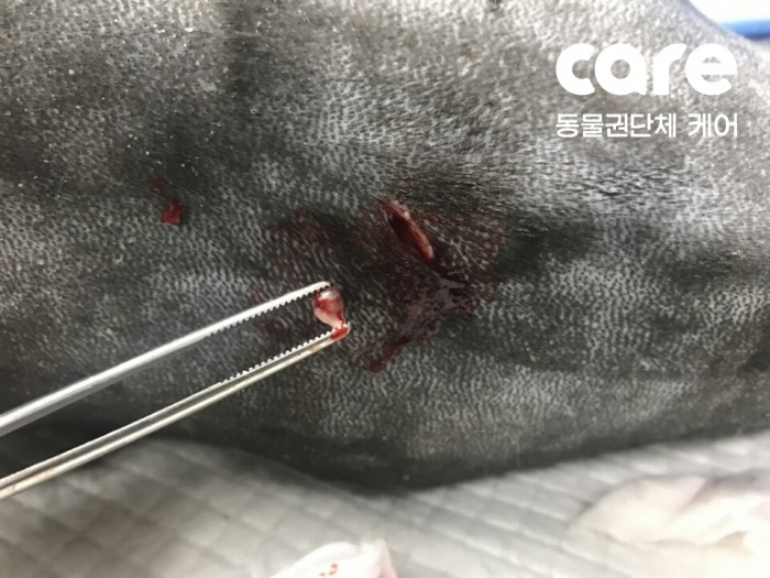 병원 측은 까뮈가 총알에 맞아 중금속 감염 우려도 있다고 밝혔다.[사진=케어] |