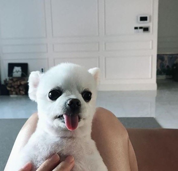 사진 속에는 귀여운 모습으로 메롱을 하고 있는 반려견 튠티미의 귀여운 모습이 눈길을 끈다.