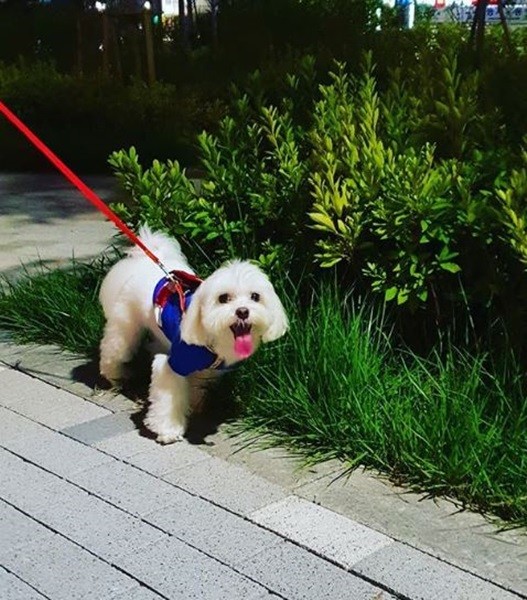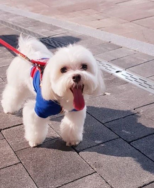사진 속에는 파랑색 옷을 입고 산책을 나온 반려견 '광복이'의 모습을 볼 수 있었다.