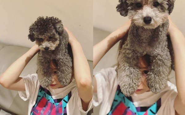 공개된 사진 속에는 태연이 강아지를 머리 위에 올린 채 인증샷을 찍고 있는 모습이 담겨 있다.