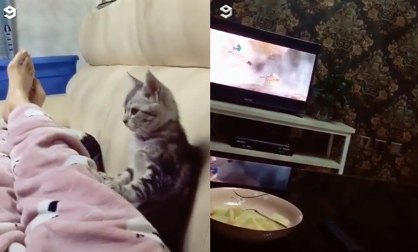 영상 속 여성은 수면바지를 입고 쇼파에 누워서 티비를 시청하고 있고, 고양이는 그녀의 허벅지 쪽에 앉아 마사지를 해주고 있다.