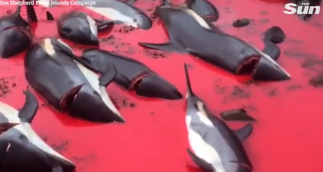 영상 속 고래들은 해변 인근에서 척추 부분이 잘린 채 둥둥 떠 있었고 바다는 핏빛으로 물들어 있었다.