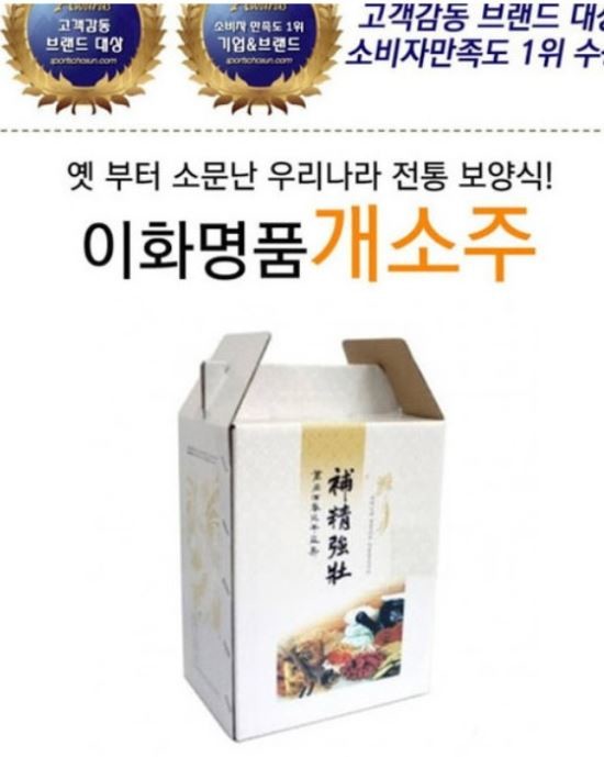 쿠팡의 개소주 상품 설명에는 토종개 75%에 각종 한약재를 넣은 보양식품이라고 소개하고 있다.